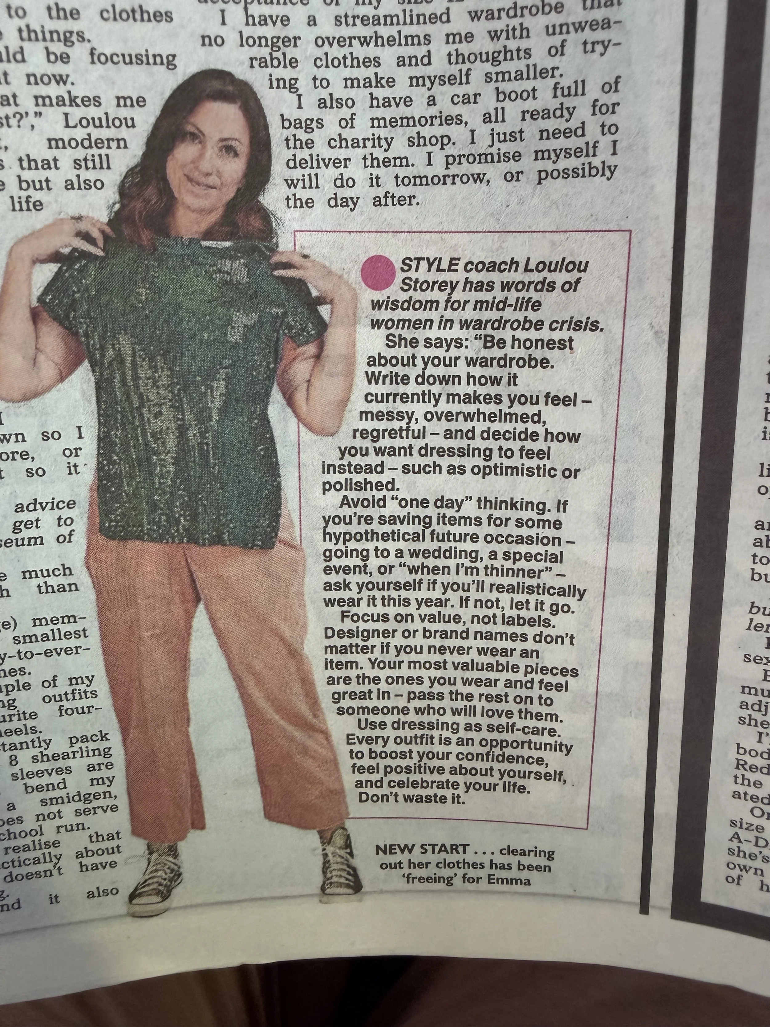 3. Dress for your life today. Look at what you do each week or month - work, gym, social life - and pull out the clothes that match your actual life. Then consider what’s left and ask can I ‘dress this item down so I can wear it more’ or tweak or alter it so they work in your actual life.
